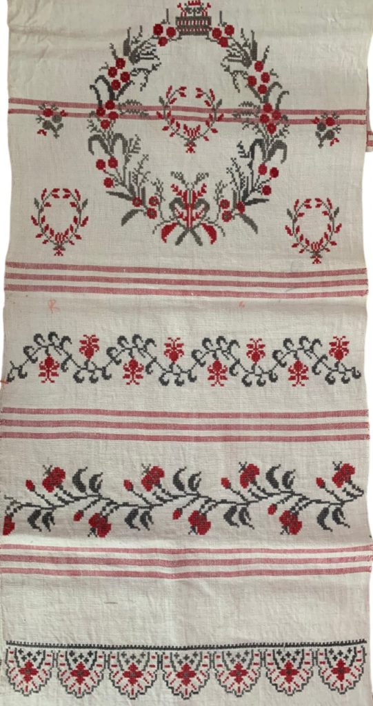 Рушник – полотенце выполнено из белой ткани домашнего или реже фабричного производства, украшенное вышивкой, несущей определенную смысловую нагрузку и кружевом ручной работы.